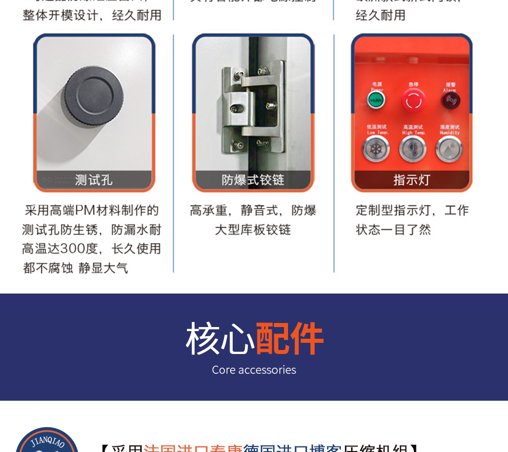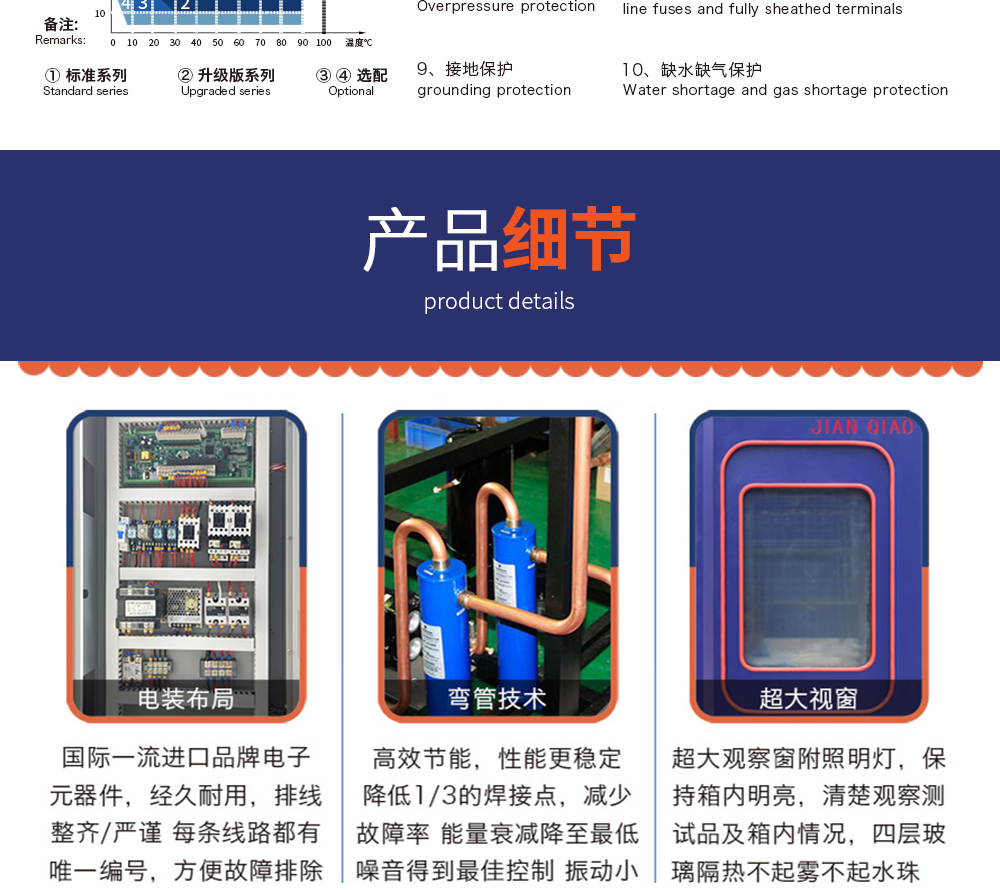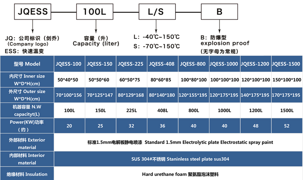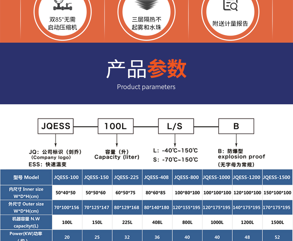 產品型號:JQESS-100 品牌:劍 喬 用途:快速溫變試驗箱主要用來測試各種材料耐熱、耐寒、耐干、耐濕的性能。本機采用中英文顯示彩色觸控式屏幕畫面,操作簡單,程序編輯容易,可顯示完整的系統操作狀況相關數據、執咨詢熱線:13829135130