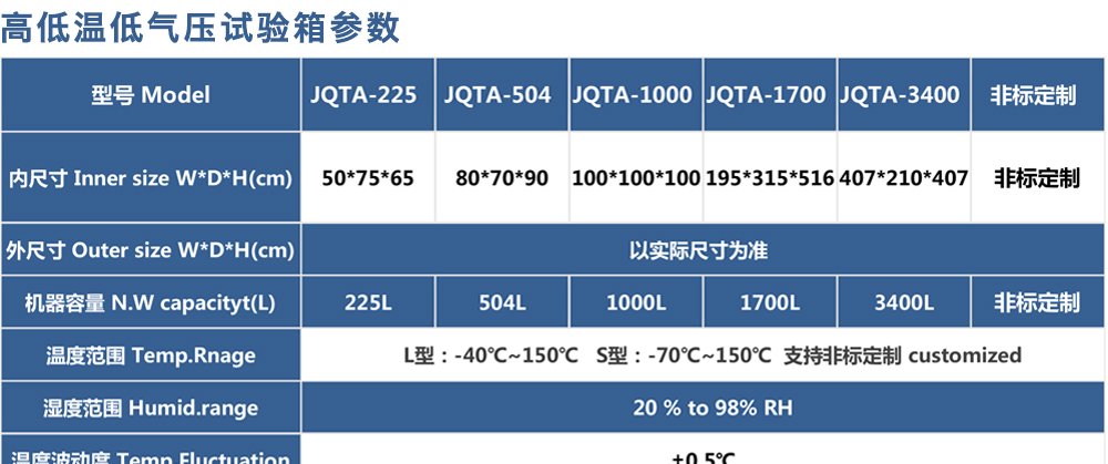 •  高低溫低氣壓試驗箱也稱為:低氣壓試驗機、低氣壓(高度)試驗箱、高低溫濕熱低氣壓試驗箱,適用于電工、電子產品及其他產品、零部件及材料進行低氣壓試驗的環境試驗箱設備,可滿足電工電子產品及軍用裝備等環境試驗 - 高溫試驗、低溫試驗、溫度變化試驗、低氣壓試驗、溫度高度試驗、低溫/低氣壓綜合試驗、高溫/低氣壓綜合試驗,適用于電工、電子、儀器儀表及其它產品零部件及材料在高低溫交變環境下貯存、運輸、使用時的適應性試驗。