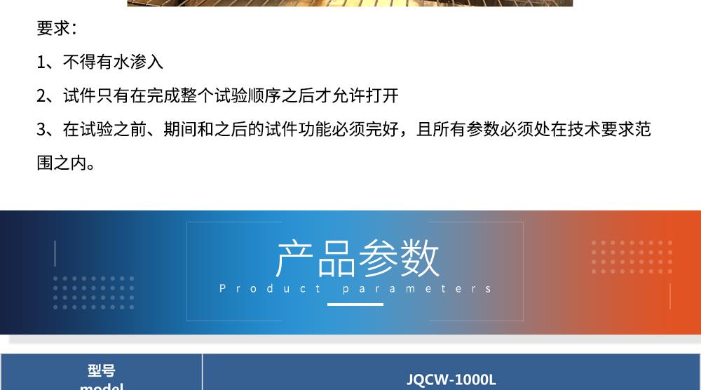 產品型號:JQCW-1000L 品牌:劍 喬 用途:冰水沖擊試驗(浪涌水的溫度沖擊試驗)是模擬部件在駛過積水時而產生的浪涌水的負荷情況,保證部件由于水而急劇冷卻情況下的功能穩定性。如車輛在冬季有水路面駕駛時冰水濺落到熱的系統/組件上,失效模式為不同的溫度膨脹系數導致的材料機械破裂或密封失效咨詢熱線:13829135130