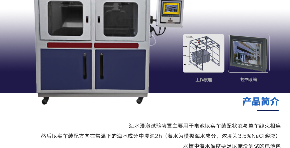 產品型號:JQ-6018 品牌:劍 喬 用途:海水浸泡試驗裝置主要用于電池以實車裝配狀態與整車線束相連然后以實車裝配方向在常溫下的海水成分中浸泡2h(海水為模擬海水成分,濃度為3.5%NaCl溶液)水槽中海水深度要足以淹咨詢熱線:13829135130
