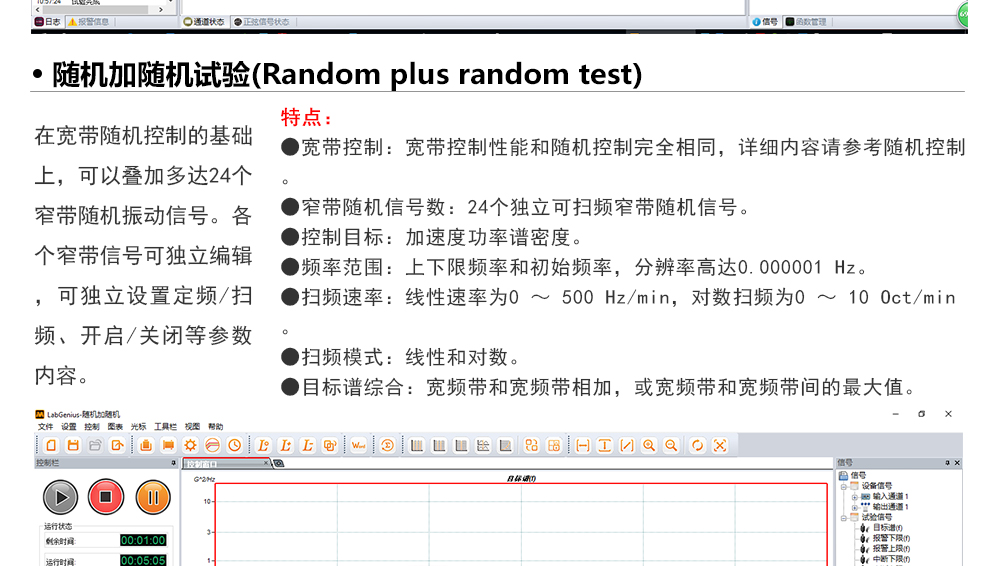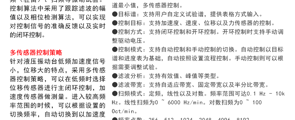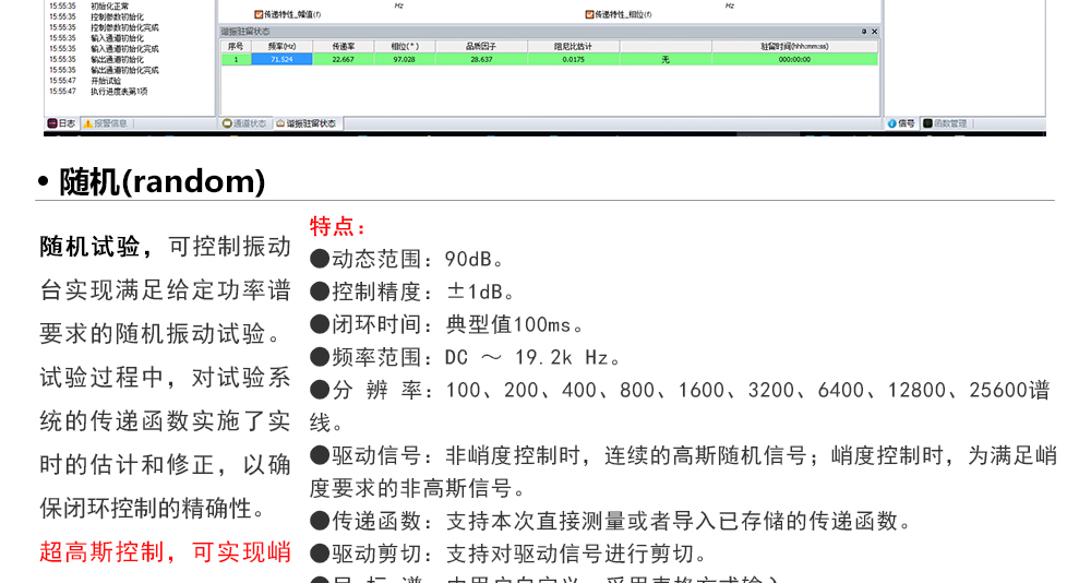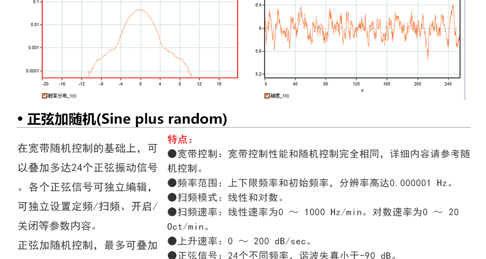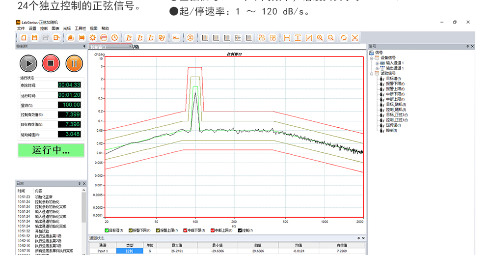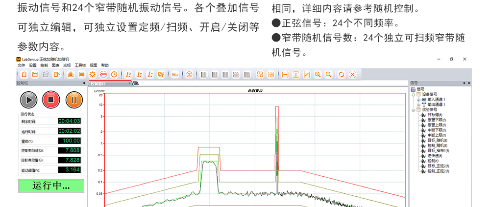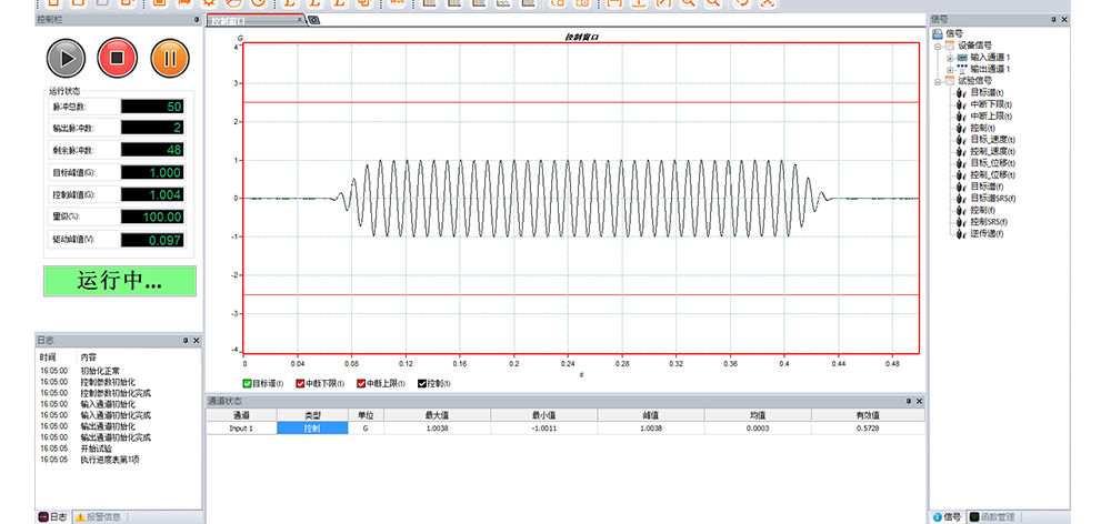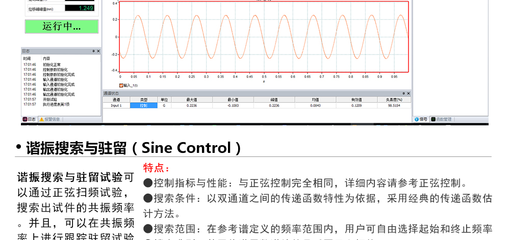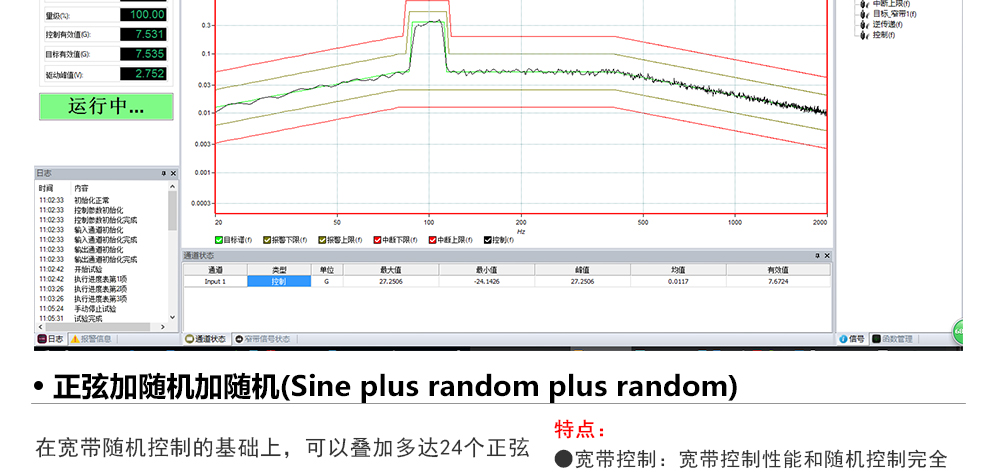 用途:正弦試驗(yàn)可以控制振動(dòng)臺(tái)實(shí)現(xiàn)定頻(駐留)、掃頻等振動(dòng)試驗(yàn)。控制算法中采用了跟蹤濾波的幅值以及相位檢測算法,可以實(shí)現(xiàn)對控制信號(hào)的準(zhǔn)確反饋以及實(shí)時(shí)的閉環(huán)控制。