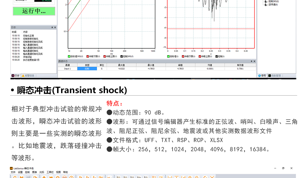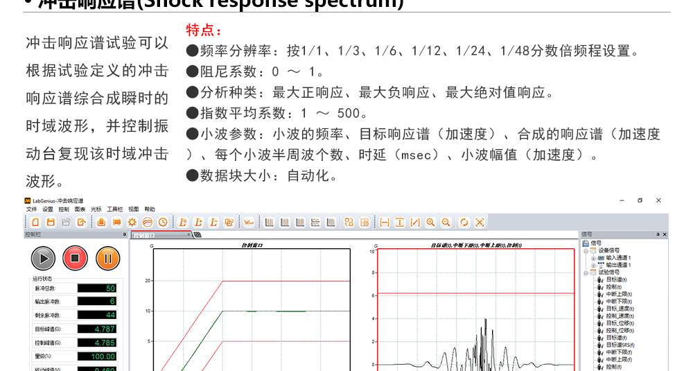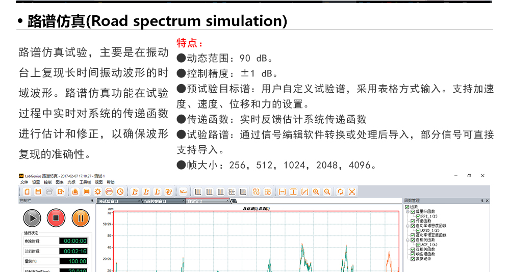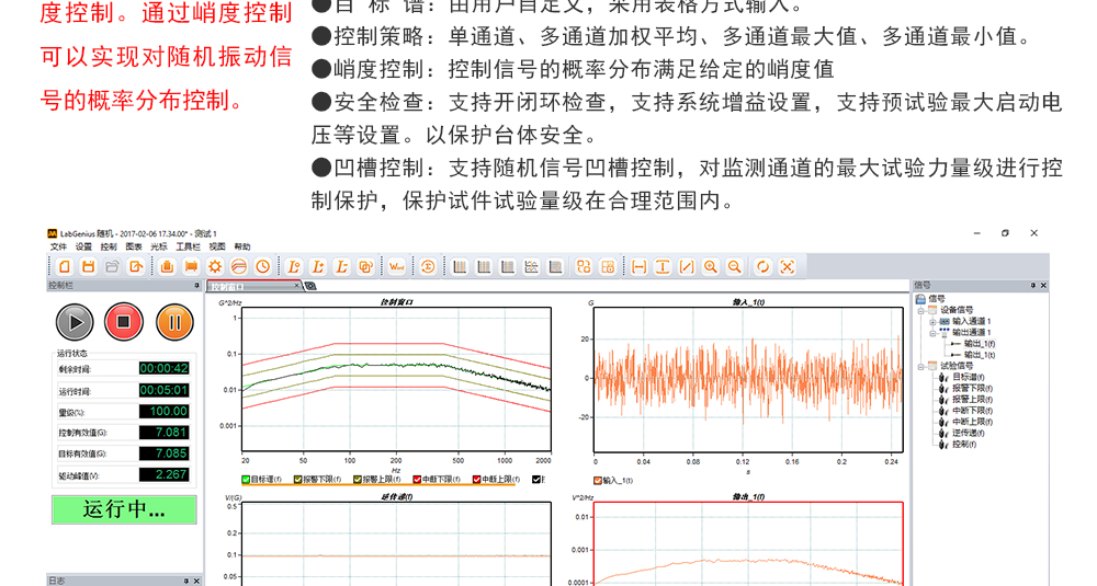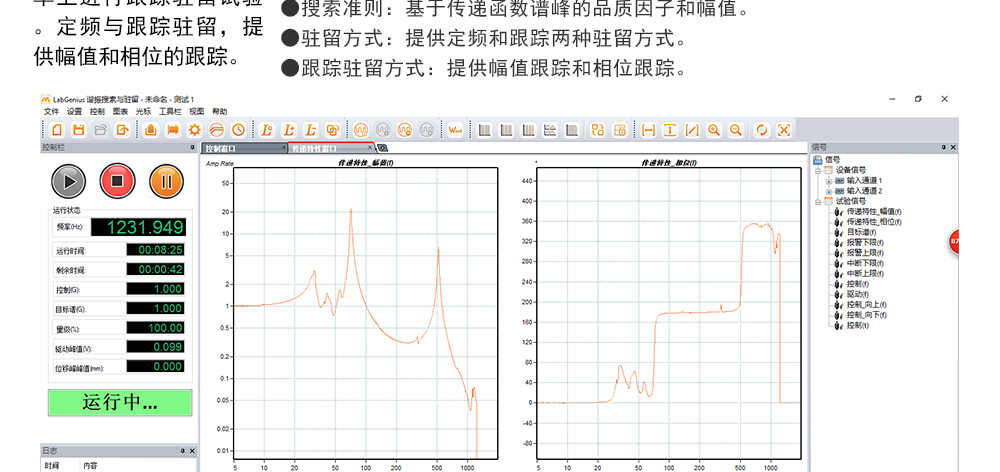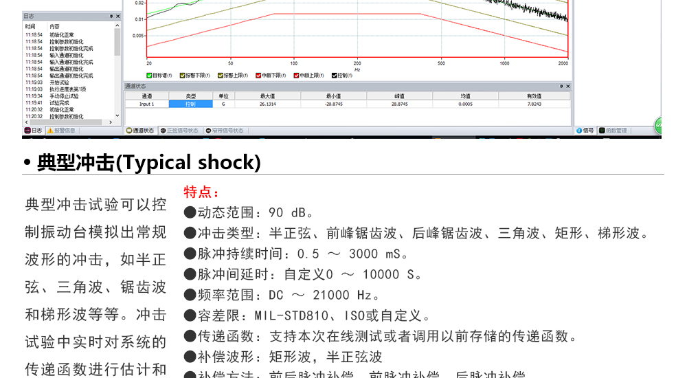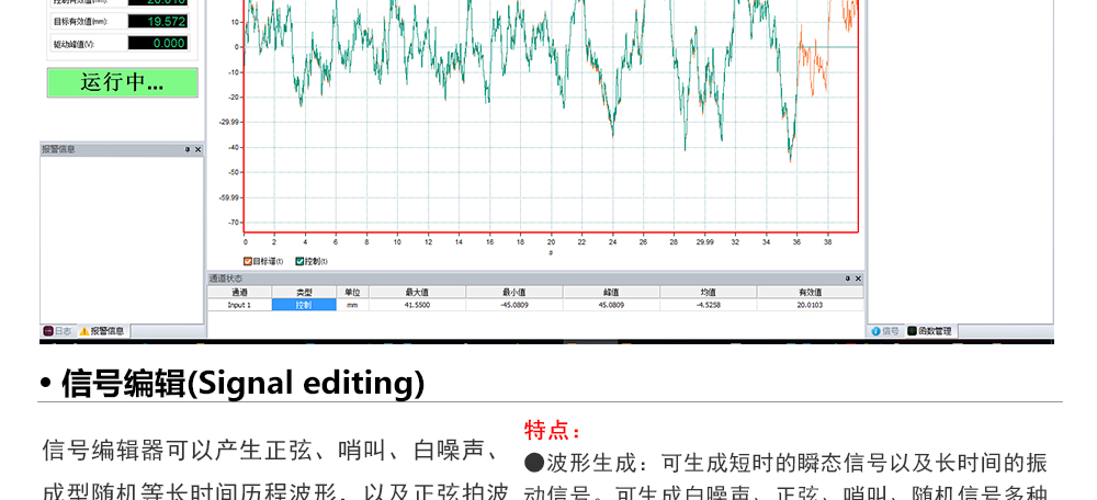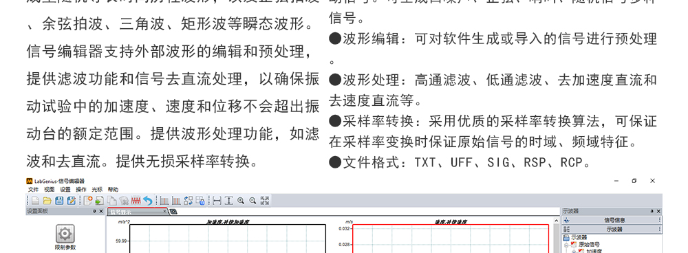 用途:正弦試驗(yàn)可以控制振動(dòng)臺(tái)實(shí)現(xiàn)定頻(駐留)、掃頻等振動(dòng)試驗(yàn)。控制算法中采用了跟蹤濾波的幅值以及相位檢測算法,可以實(shí)現(xiàn)對控制信號(hào)的準(zhǔn)確反饋以及實(shí)時(shí)的閉環(huán)控制。